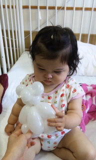 そんな中、ノックの音にドアを開けると、仲良しのママが『クラウンさんに作ってもらった』とバルーンの白くまさんを持ってきてくれました(o^∀^o)